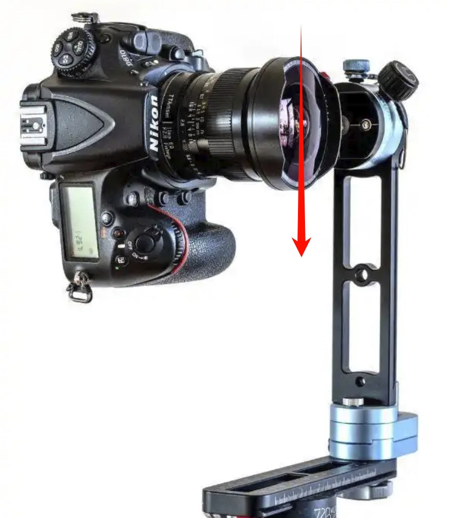 在我们进行VR全景拍摄的过程中,除了部分要求不高的使用VR全景相机外,专业的都是用专业相机,我们在使用专业相机的时候,必不可少的就是VR云台,在长时期用过VR云台的人我想都会遇到一个相当无语的问题:拍摄过程中会出现相像镜头向正下文下垂,如下图箭头方向下垂。